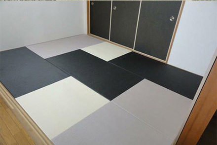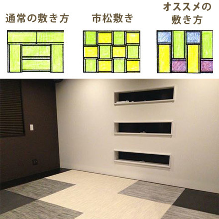 今までの畳は一部屋全ての畳は、同じ色柄、同じ素材、同じ大きさ・・・均一である事が常識でした。モダン乱敷きはヘリがある畳とない畳・カラーの畳と天然色の畳・正方形の畳と長方形の畳・様々なタイプの畳を組み合わせて、よりデザイン性に富んだご提案を可能としています。